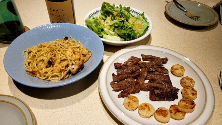 오늘의 저녁은 알리오 올리오 스타일 오일 새우 파스타, 미디엄 웰던 등심 스테이크, 구운 관자, 상추샐러드이다. 쌀밥이 없으니 꽤나 다이어트를 한 기분이 들었지만 어제 마라톤 기념으로 먹다 남은 야식 치킨을 추가하느라 배를 기어코 채우고야 말았다. 핑계 가득한 인생이여.