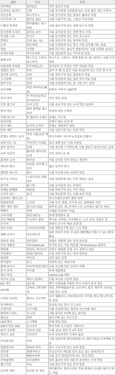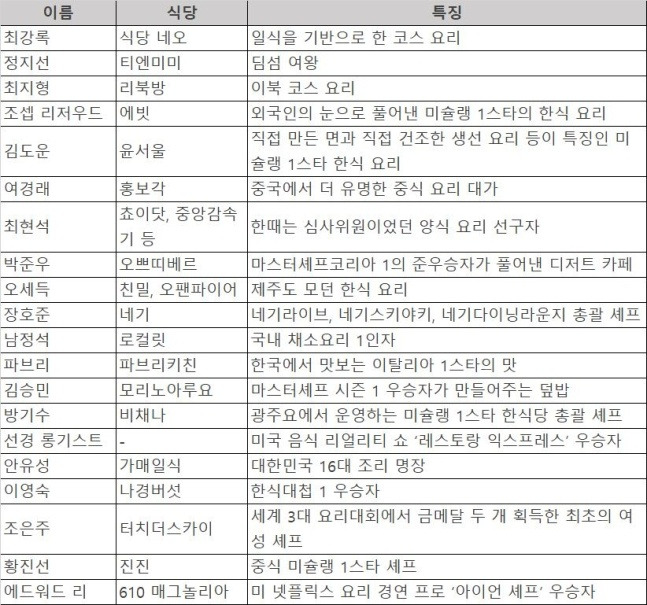 * 스타 셰프, 최현석, 중식 그랜드 마스터 여경래, 마스터 셰프 코리아 2 우승자 최강록, 한식대첩 2 우승자 이영숙 ,아이언 셰프 우승자 에드워드 리 등